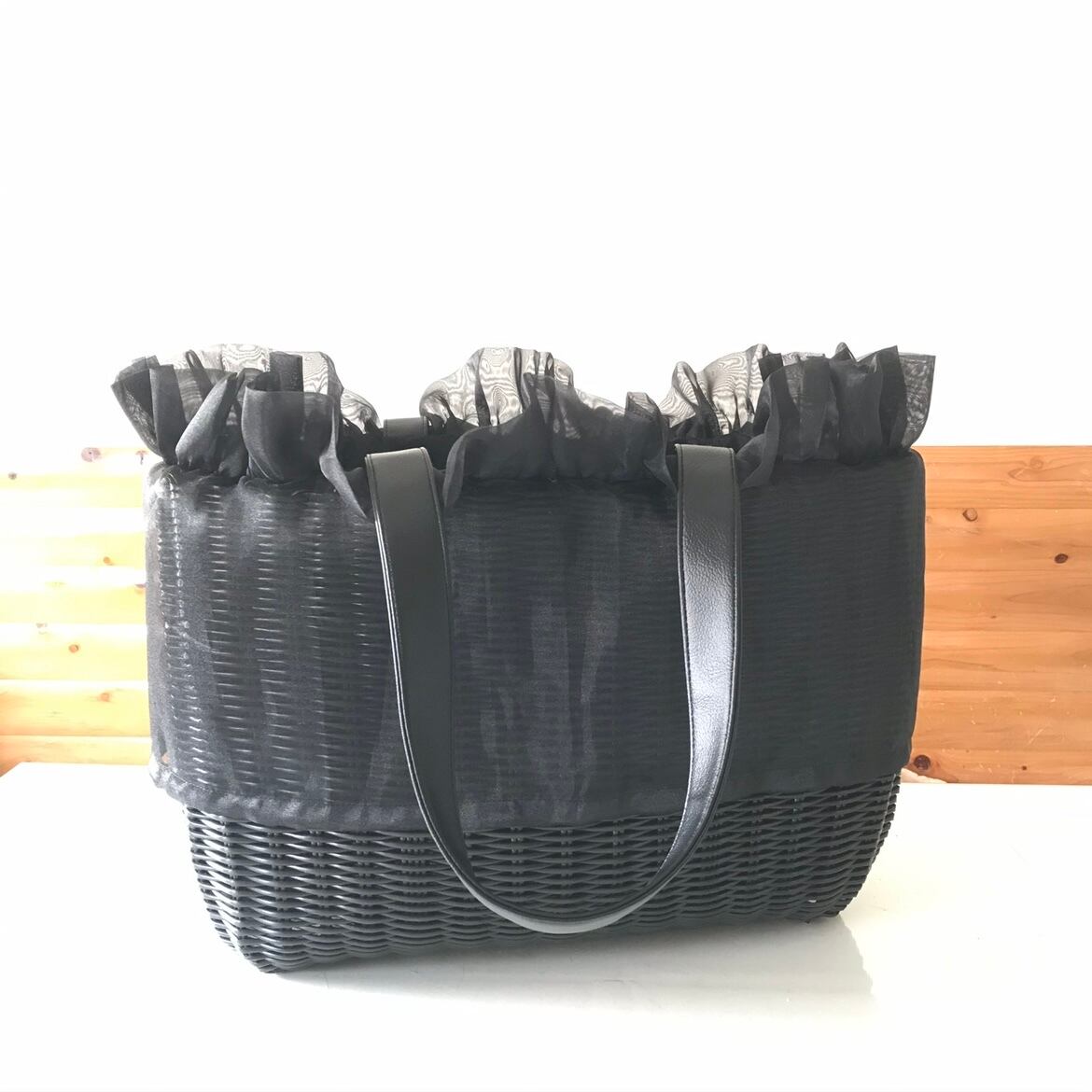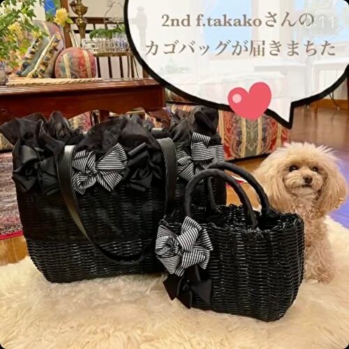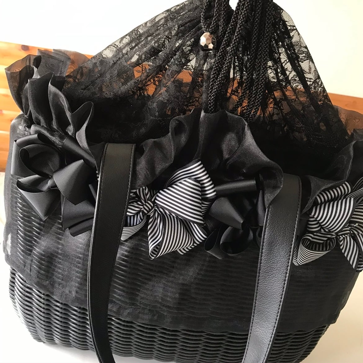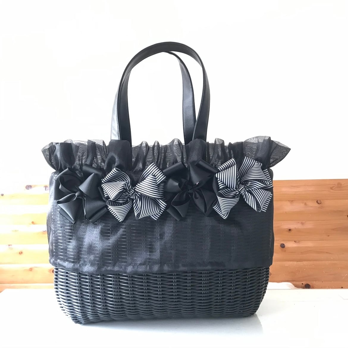 ブラック 4キロまでサイズ カゴキャリー ベーシックモデル リボン4個付き ショルダータイプ リボン4個付き ショルダータイプリボン4個付き グログランリボン黒2個+黒×グレーストライプ2個