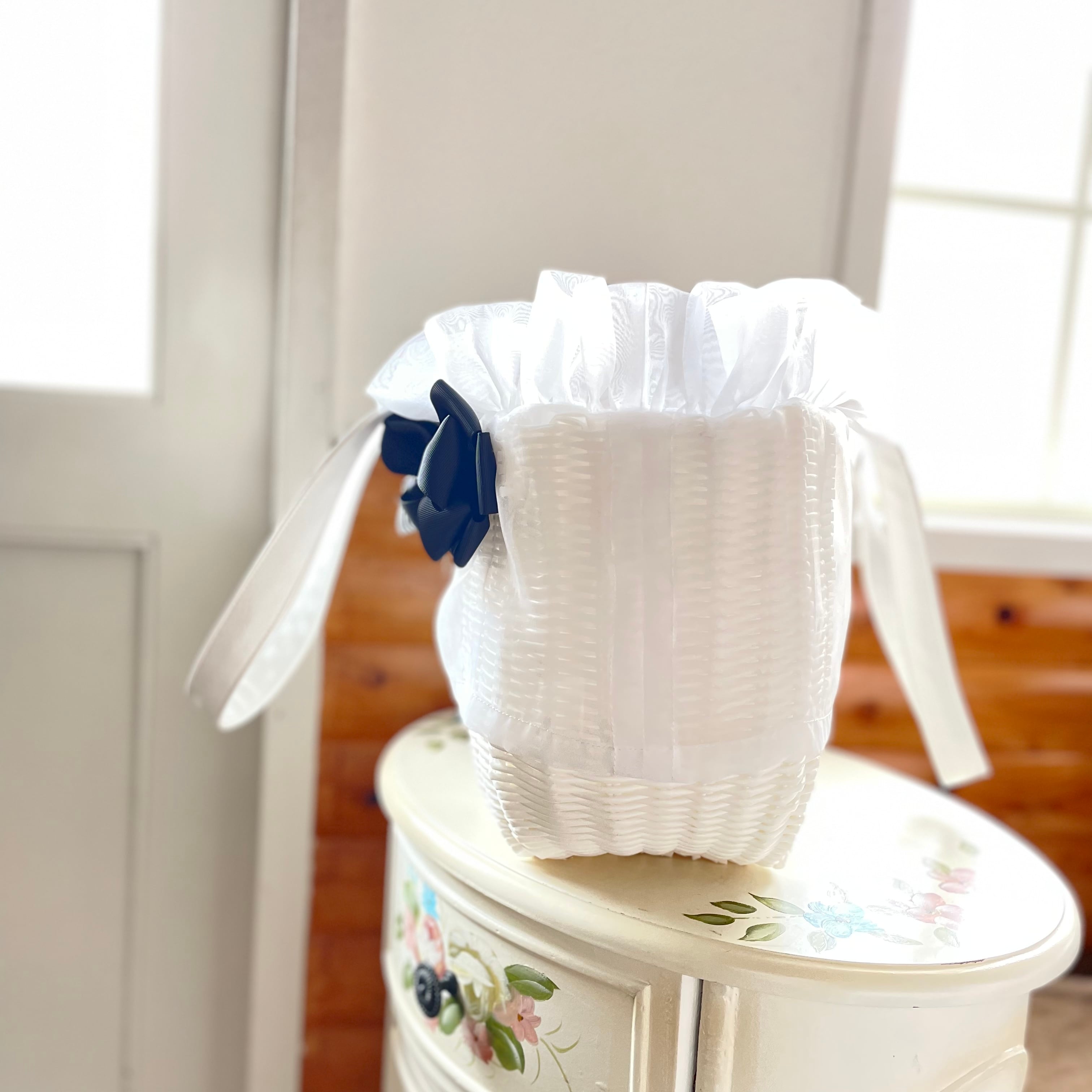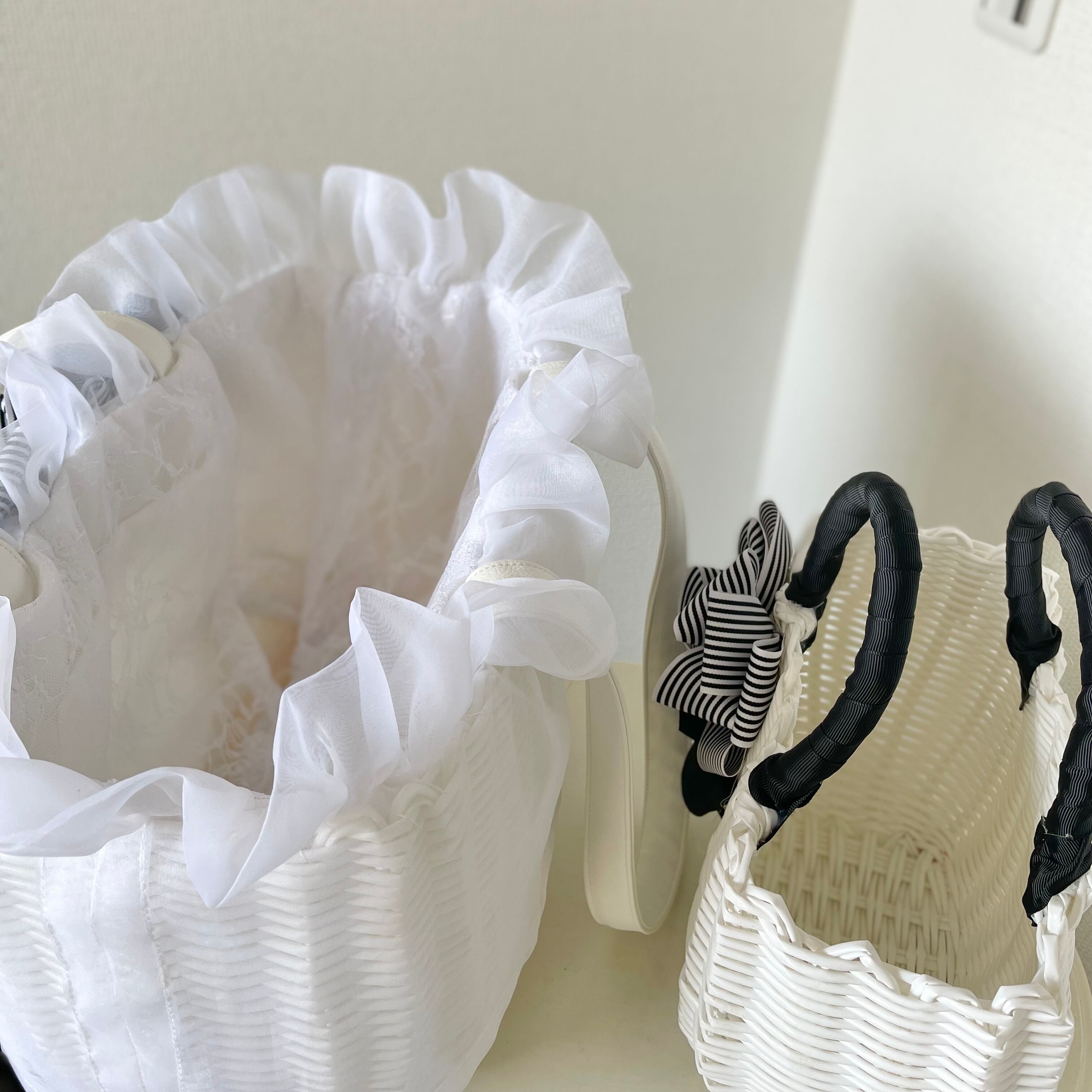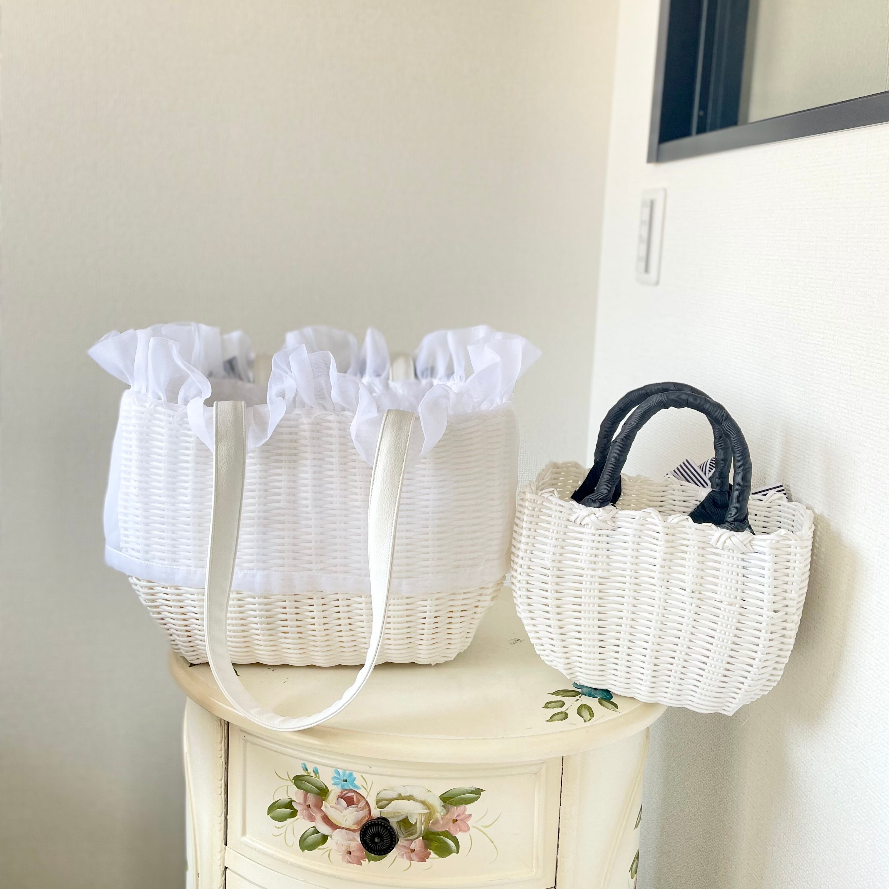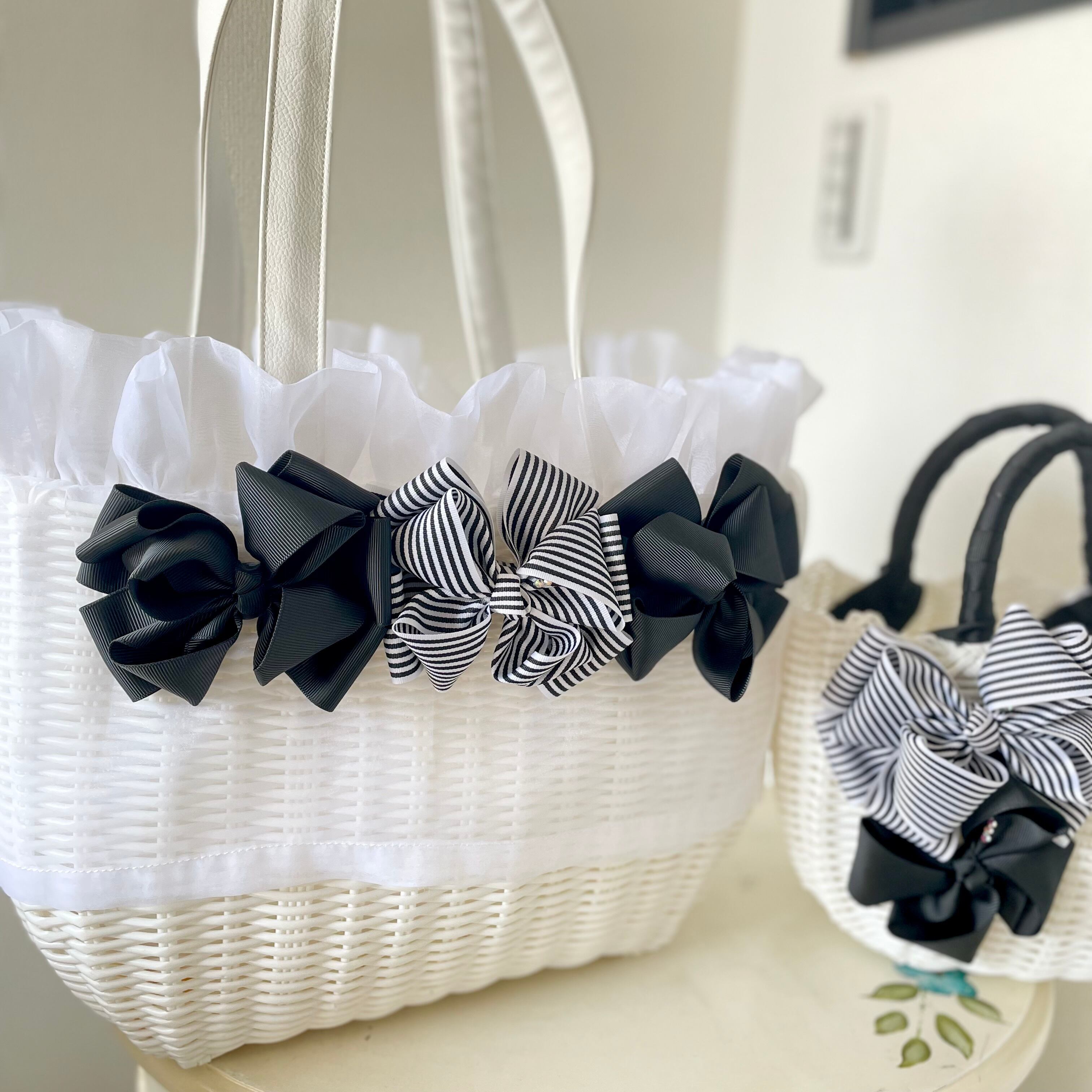 ホワイト 2キロまでサイズ&レディースカゴバッグ カゴキャリー ショルダータイプ ベーシックモデル リボン3個付き グログランリボン黒2個+白×黒ストライプ1個